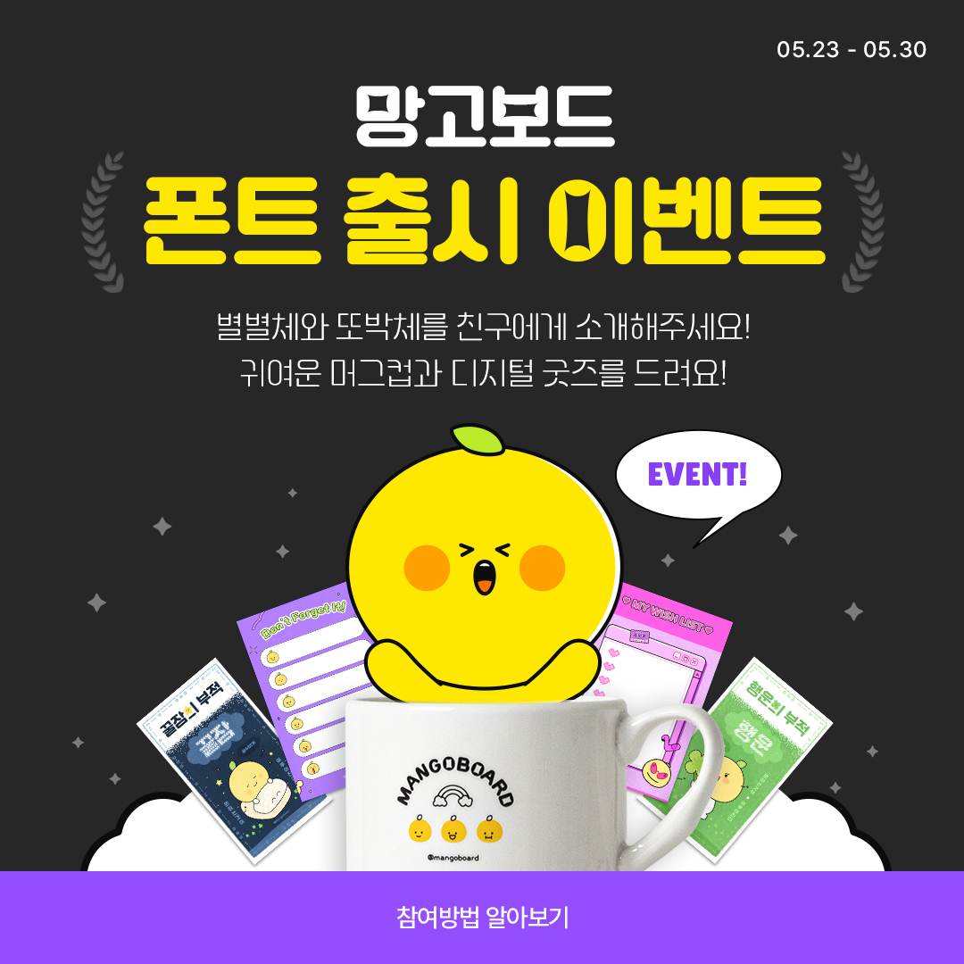 망고보드 폰트 별별체와 또박체 감상평 남기고, 귀여운 머그컵과 디지털 굿즈 받아가세요!