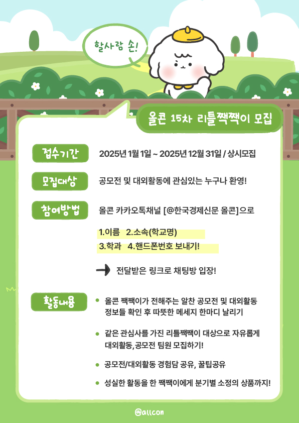 유익한 정보만을 물어 전달하는 올콘 짹짹이와 함께할 리틀짹짹이를 모집합니다.
