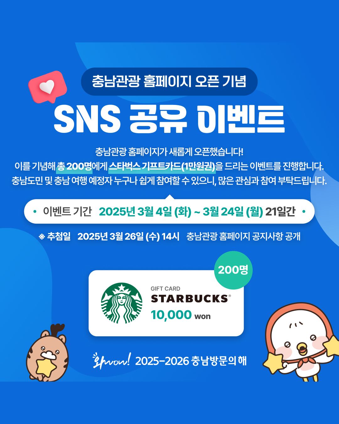 당첨자 발표 : 25.3.26.(수) 14시 (충남관광 홈페이지 공지사항 공개)
