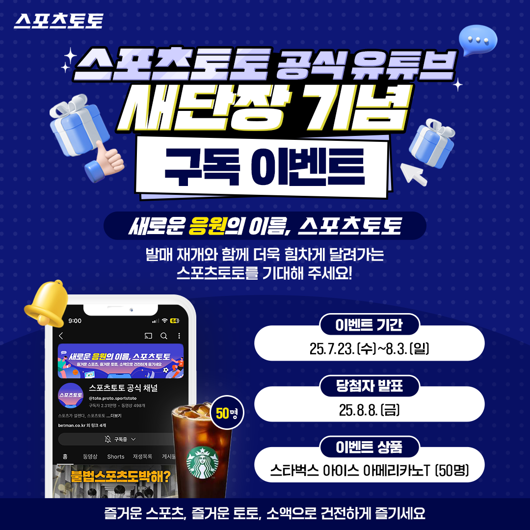 새로운 응원의 이름, 스포츠토토 스포츠토토 유튜브 채널이 새롭게 단장했습니다! 발매 재개와 함께 더욱 힘차게 달려가는 스포츠토토를 응원해 주세요💝 추첨을 통해 총 50분께 선물을 드립니다! 👉이벤트 참여 방법 1️⃣ 스포츠토토 유튜브 구독하기! (기존 구독자도 참여 가능!) 2️⃣ 구독 화면 캡처본을 이벤트 폼에 등록하기! *이벤트 폼: https://forms.gle/WfmETPJem15qZ4qX7 3️⃣참여 완료 댓글과 함께 기대의 한마디 댓글을 남기면 당첨 확률 UP! 🎁 이벤트 경품 : 스타벅스 아이스 카페 아메리카노T (50명) ➡️ 이벤트 기간 : 7월23일(수)~8월 3일(일) ➡️ 당첨자 발표 : 8월 8일(금) #스포츠토토 #건강한_스포츠문화 #유튜브이벤트 #구독이벤트 #프로토 #토토 #한국스포츠레저 #서울올림픽기념국민체육진흥공단