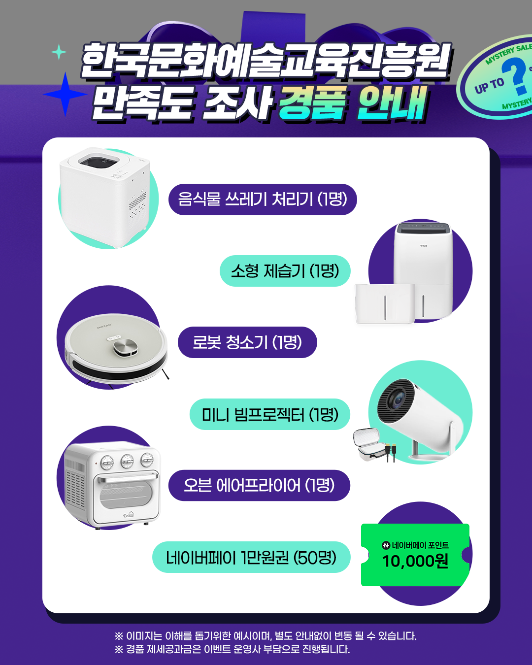 | 시상내역 | 음식물 쓰레기 처리기(1명), 소형 제습기(1명), 로봇청소기(1명) 미니 빔프로젝터(1명), 오븐 에어프라이어(1명), 네이버페이 포인트 1만원권 (50명) |