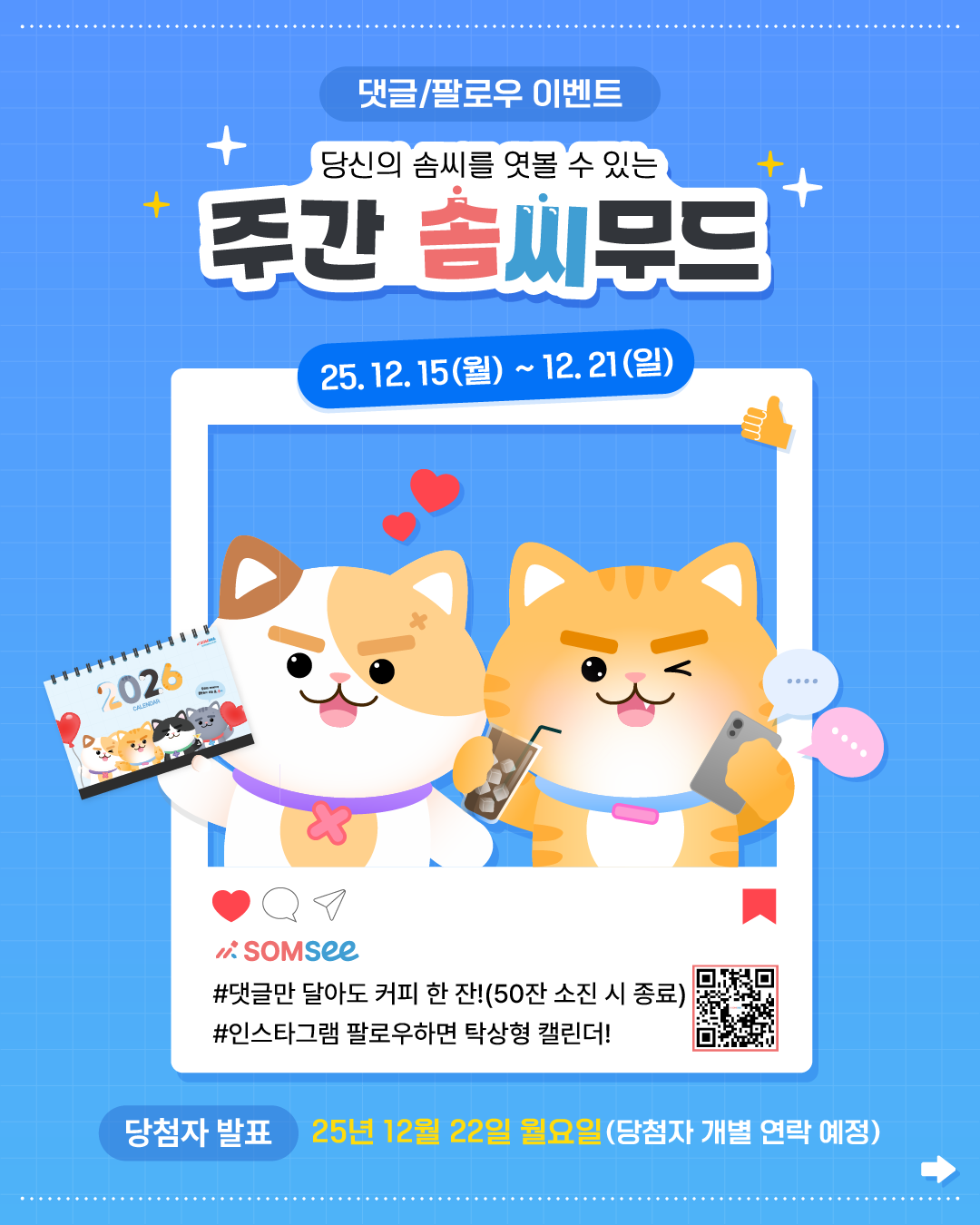 추가 참여: 인스타그램(www.instagram.com/somsee.official/) 팔로우 후, 솜씨 콘텐츠 내 댓글에 인스타 ID 기재해 주세요.