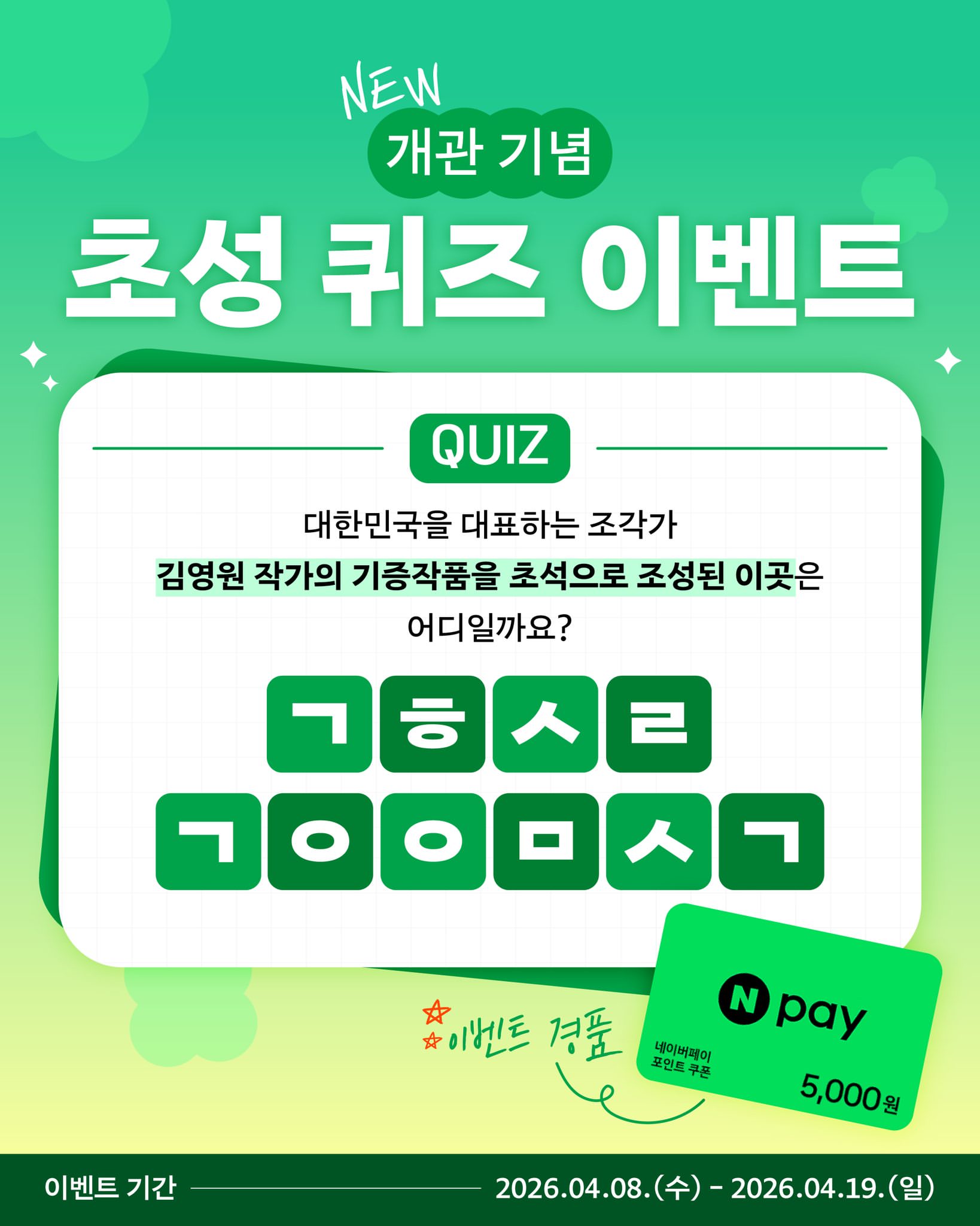 [김해시립김영원미술관] 네이버페이 5천원권을 무려 20분께 드려요! 초성 퀴즈 이벤트⭐